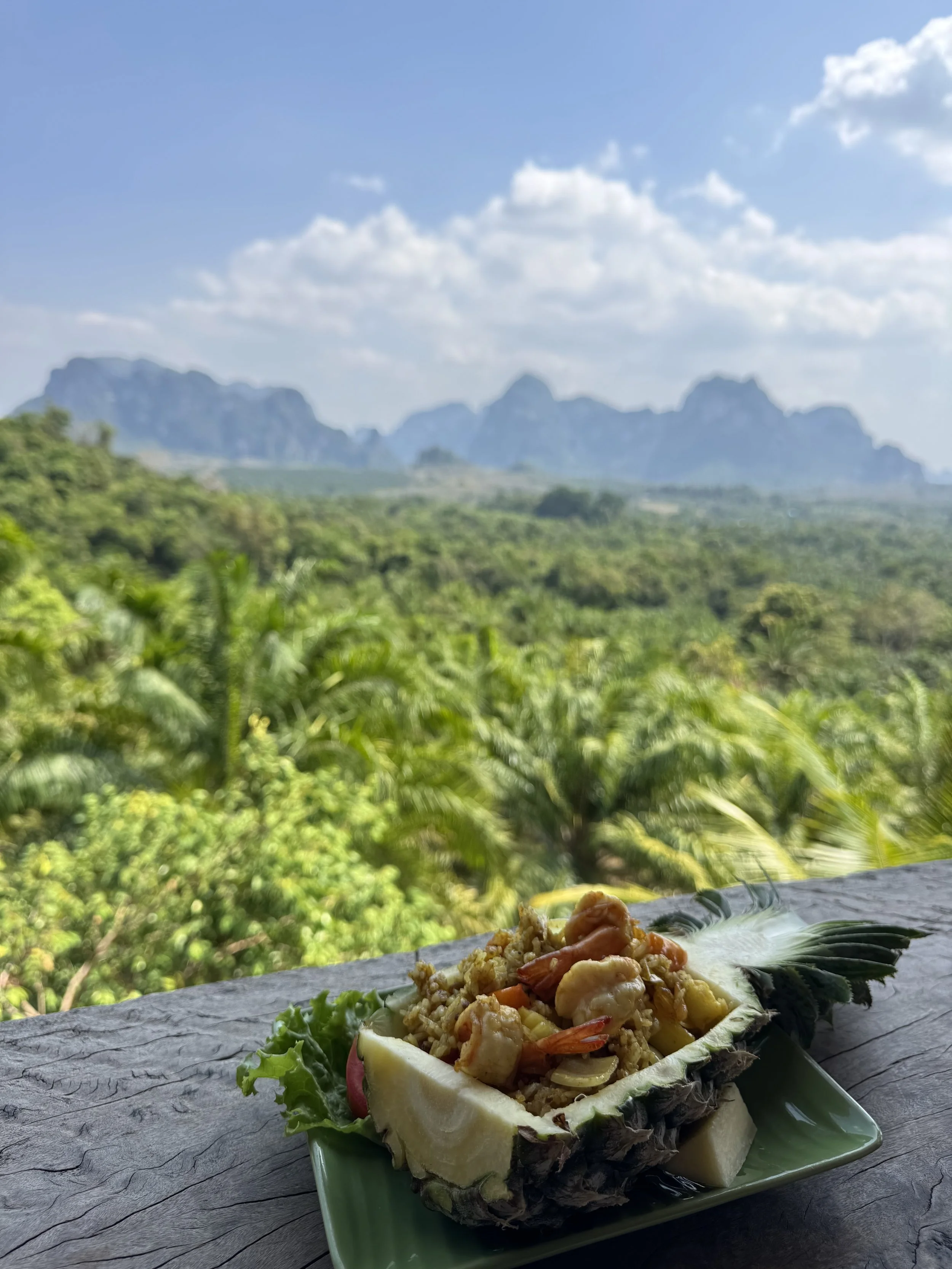 Lunch at Kuan Nom Saow Restaurant and Viewpoint required a bumpy ride through jungle terrain and a short, steep climb—but once you arrive, it’s absolutely worth it. The restaurant is rustic and charming, built from natural wood and bamboo with an open-air design that lets the rainforest breeze flow through. Simple, sturdy tables with colorful cushions add a cozy, relaxed feel. We sipped fresh coconut water while waiting for our pineapple fried rice, enjoying bucket-list views of lush jungle, dramatic limestone karsts, and the Krabi coastline. The food was fresh and flavorful, perfectly complementing the stunning surroundings.